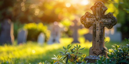 Weathered cross stands prominently in cemetery, illuminated by warm glow of sunlight during sunset. serene atmosphere evokes sense of peace and reflection
