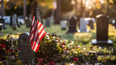 American flags and flowers are placed in the foreground of a cemetery, creating a patriotic and respectful atmosphere. The flags wave gently in the breeze, while the flowers add color and beauty to the somber setting.