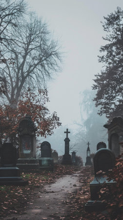 Gravestones in a misty graveyard with fallen leaves and trees