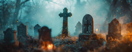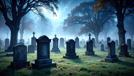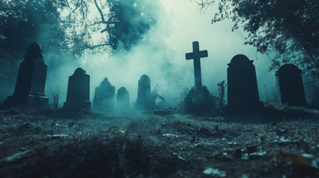 Misty graveyard at dusk with silhouetted tombstones and haunting atmosphere