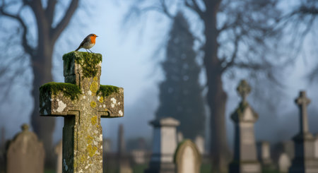 Robin on mossy tombstone in misty cemetery at dawn