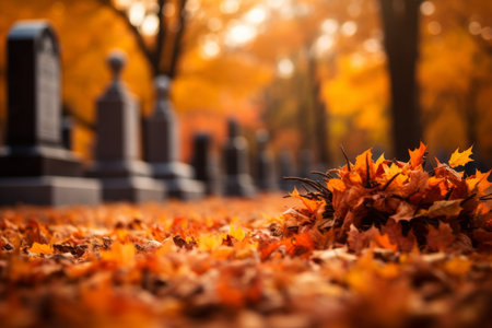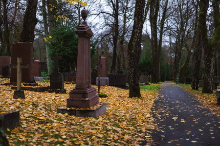 A serene cemetery scene with fallen leaves, tombstones, and a pathway under a cloudy sky.
