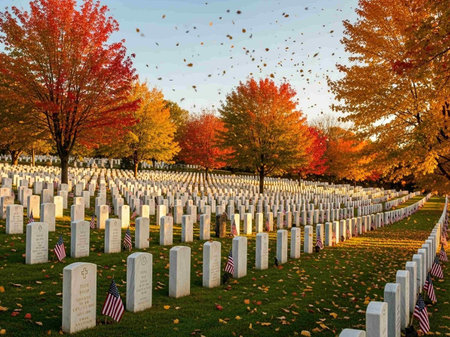 Warm Sunset Over Tranquil Cemetery with Vivid Flowers and American Flags on Memorial Day.