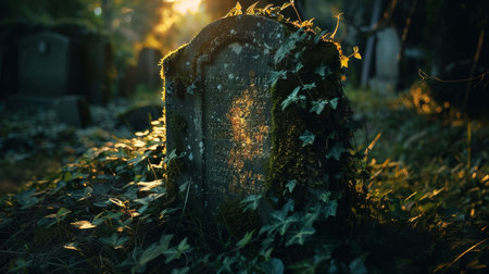 Time-worn tombstone buried under moss and ivy, glowing eerily in the dim evening light