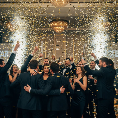 Graduates wearing caps and gowns experiencing a commencement event, celebrating academic achievement and success in a grand hall with confetti falling