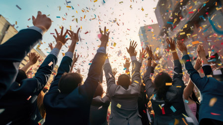 several business people throwing confetti around with hands up. success in business, completion of project, carefree and joyous atmosphere creates an impression of positive emotions, and teamwork