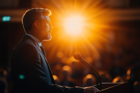 Businessman giving an inspiring presentation at a corporate conference, backlit by a warm spotlight