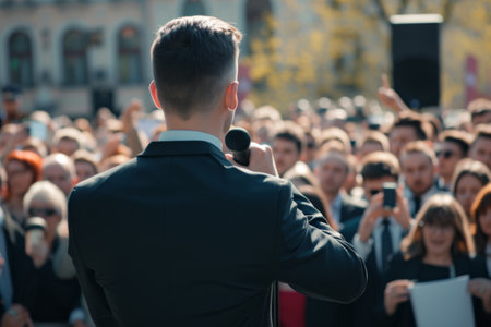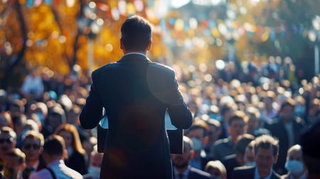 Confident Male Politician Speaking at an Outdoor Rally with a Diverse Audience. Male speaker addressing crowd at an event
