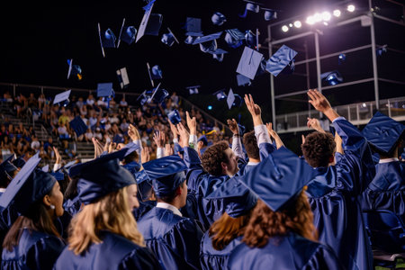 A vibrant graduation ceremony showing students joyfully tossing their caps in the air, surrounded by an enthusiastic audience celebrating their achievements.
