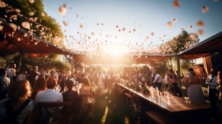 Joyous wedding scene with bride and groom, confetti rain, colorful, festive atmosphere. AI generative.