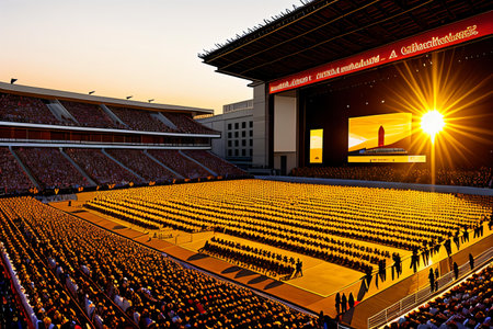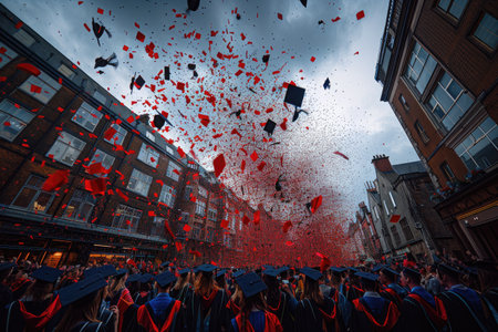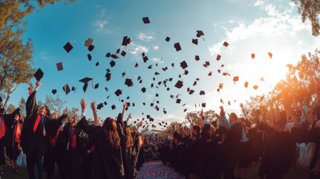 A panoramic view of a graduation ceremony with students throwing their caps in the air, celebrating their academic achievements and the joy of graduation.