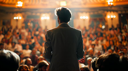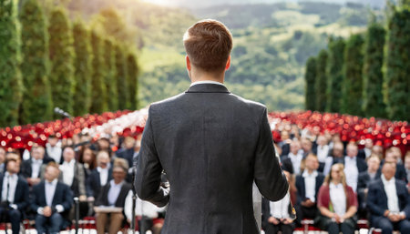 A dynamic back view of a man wearing a polished business suit, confidently addressing a captivated audience while speaking on stage at a professional conference or corporate event in a spacious