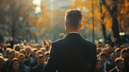 Leader inspiring a crowd with unique leadership qualities in a motivational speech