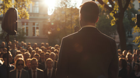 A speaker stands before a captivated audience in an outdoor setting, delivering an engaging speech, while sunlight illuminates the gathering.