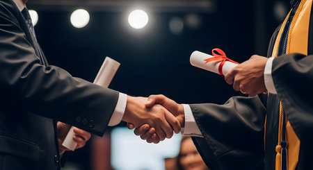 A close-up shot of a graduate in a black and gold gown receiving a rolled-up diploma tied with a red ribbon. The graduate is shaking hands with a person in a suit, likely a professor or dean, at a graduation ceremony. The background is dark with bokeh lights.
