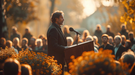 Mature Man Delivering Eulogy at a Formal Memorial Service. A.I.