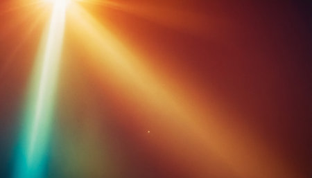 Retro-styled, grainy effect photo featuring colorful light rays on a dark surface