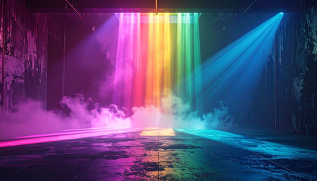Vibrant rainbow light beams dramatically illuminate the interior of a large industrial warehouse.