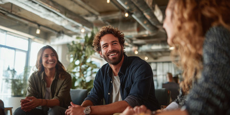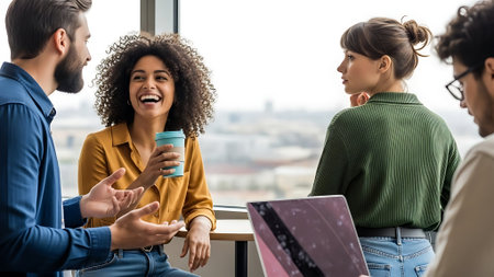 Group of friends talking and laughing in a modern office space during the day