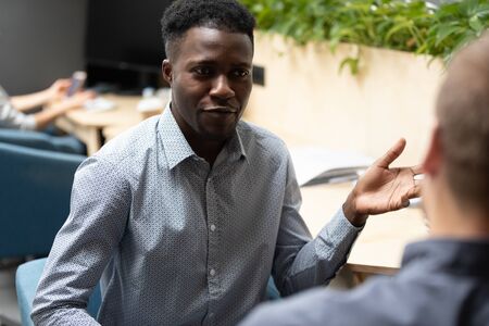 Confident African American businessman manager consulting client in office close up, financial advisor, executive making offer, diverse colleagues working on project together, talking, sharing ideas