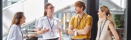 cheerful employees in smart casual clothing smiling and discussing work, coworking concept, banner