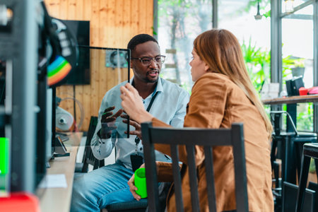 Two product designers examine and discuss 3D printed prototypes in design studio. Highlighting teamwork, creativity, and hands-on testing in product development using additive manufacturing technology