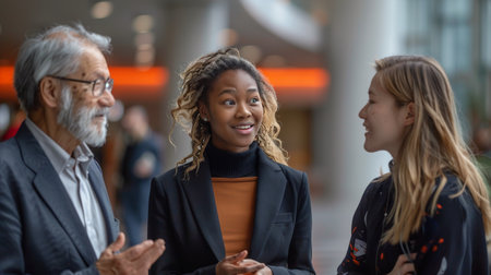 Successful networking event for diverse professionals in business attire, engaging in multicultural conversations, exchanging ideas and fostering teamwork