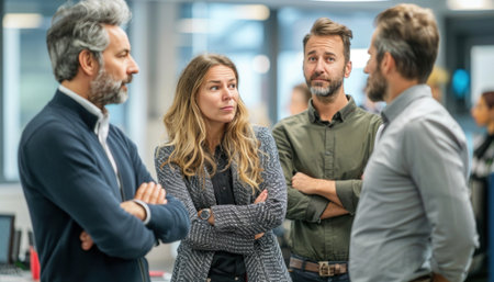 Three professionals, two men and one woman, in a heated discussion, wearing business attire, in a modern office.