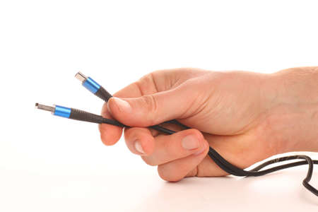 USB cable in hand on a white background