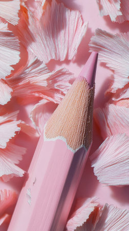 Close up of pink pencil tip on scattered shavings against blue background, artistic inspiration concept