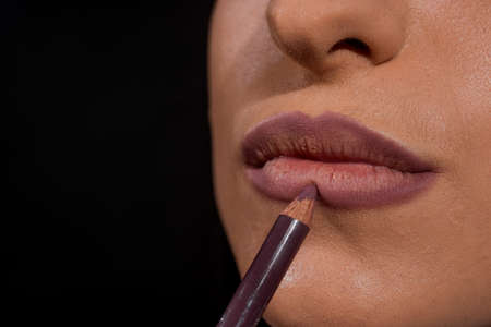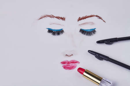 Female face drawn by makeup tools on white surface. Woman with closed eyes.