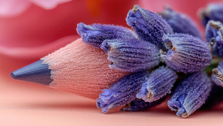 Close-up image of a colored pencil with a cluster of dried lavender flowers. The focus is on the intricate texture of the pencil's wooden shaft and the delicate structure of the lavender blossoms. The image showcases the contrast between the smooth, vibrant color of the pencil and the dried, textured flowers. The lighting and composition highlight the beauty of both subjects.