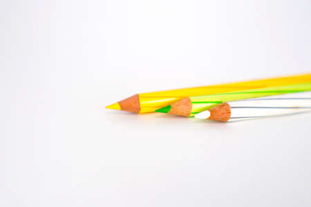 Top of the pencil. Multi-colored pencils in a row on the side and at an angle folded by a pyramid on a yellow background. Pencils lie on a heap in close-up. LGBT