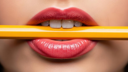 A woman's full, red lips gently bite down on a bright yellow pencil, creating a suggestive and intriguing visual