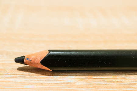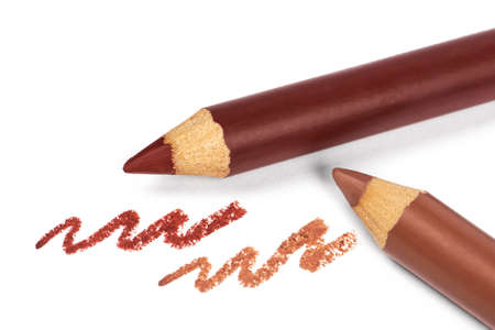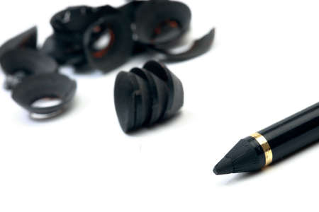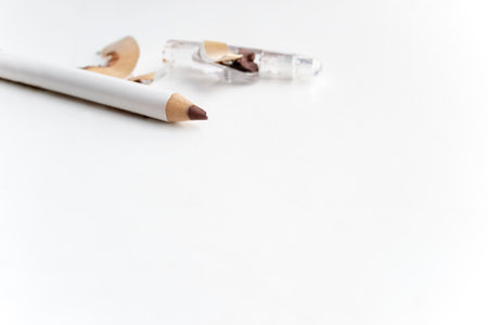 A broken eye pencil lies on a white table. On a white background, the claze pencil is brown with a broken rod. Sharpen a pencil for eyes and eyebrows.
