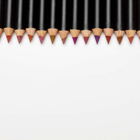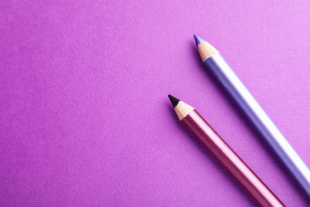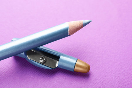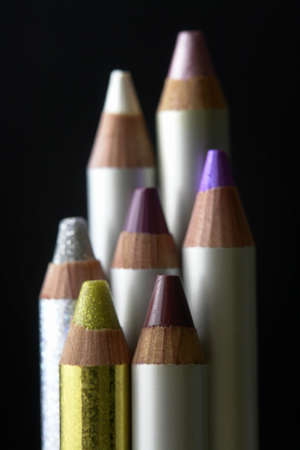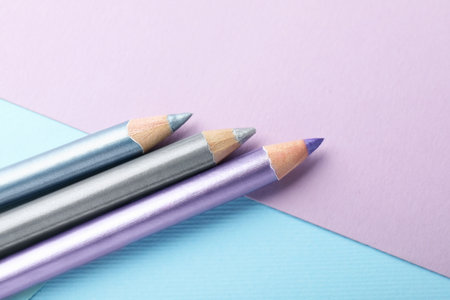 Multi shades of eyeliner on an isolated purple and blue background. makeup products