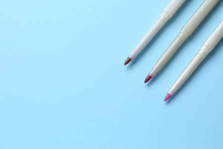 Different lip pencils on light blue background, flat lay with space for text. cosmetic product