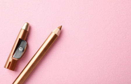 Golden eye pencil and sharpener on pink background, flat lay. Space for text