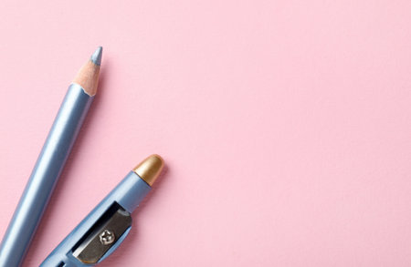Light blue eye pencil and sharpener on pink background, flat lay. Space for text