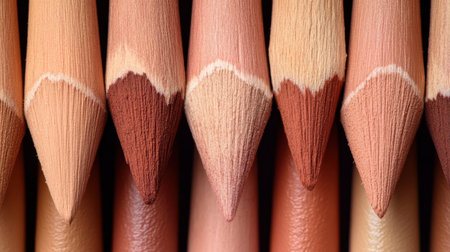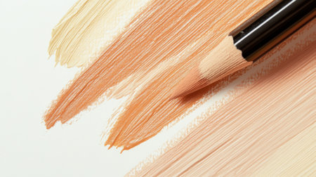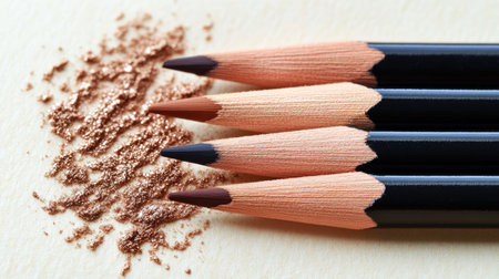 A stunning display of makeup pencils in soft colors arranged beside a shimmering loose powder on a cream background, ideal for beauty and art themes.