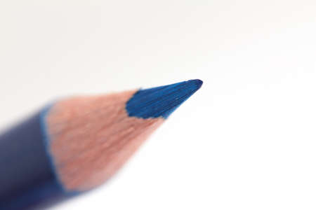 Close up picture of a nicely sharpened blue colored wood pencil crayon before a white background