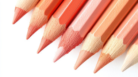 A collection of colored pencils arranged in a row showcases a smooth gradient in coral hues. This display emphasizes the range of shades available for creative projects, inspiring artists.