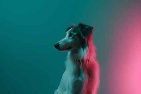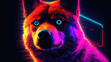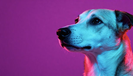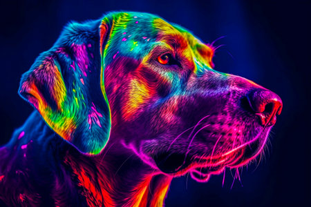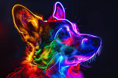 Captivating portrait of a dog with neon lights creating a colorful, glowing effect