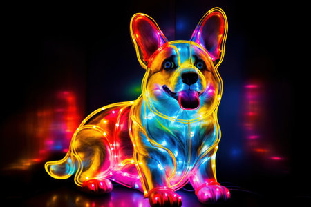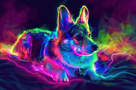Digitally illustrated corgi dog in a neon glow, with vivid colors on a dark background
