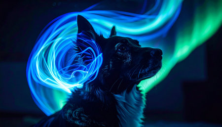 A loyal canine sits in quiet contemplation, its silhouette a stark contrast against a mesmerizing vortex of swirling blue and green light. This image captures a moment of surreal magic, blending the familiar form of a pet with a futuristic, otherworldly energy, perfect for concepts of innovation, mystery, and the digital frontier.