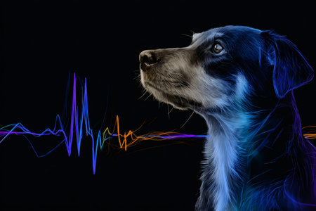 Dog profile with glowing aura representing sound waves on a dark background, showing enhanced hearing