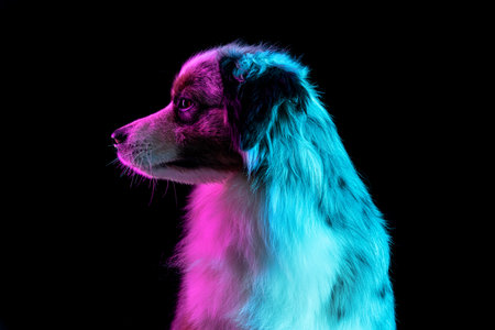 Close-up Australian Shepherd dog isolated over dark background in neon light
