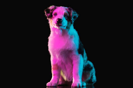 Portrait of Australian Shepherd dog isolated over dark background in neon light