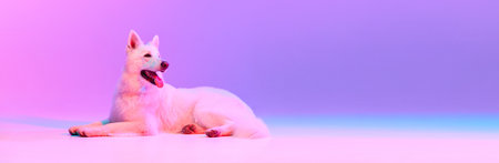 Studio shot of White Swiss Shepherd Dog calmly lying isolated over gradient pink purple background in neon light. Concept of pets, domestic animal, care