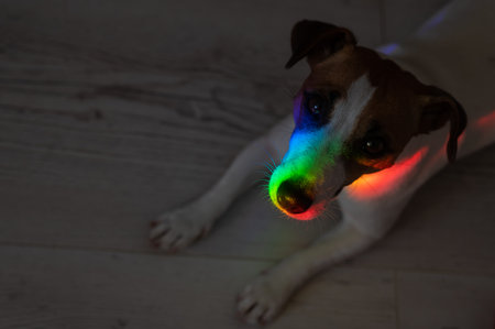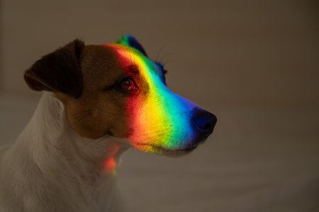 Rainbow rays on the muzzle of a Jack Russell Terrier dog.